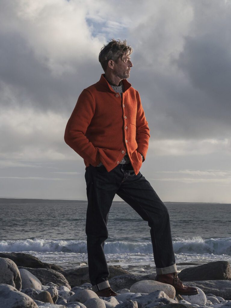Available in Navy Mix, a dark navy combined with a sporty grey marl creating distinctive colour interest, and a longtime best-seller colour way of vibrant Orange. Designed, made and hand-finished in our Aran Islands workshop.